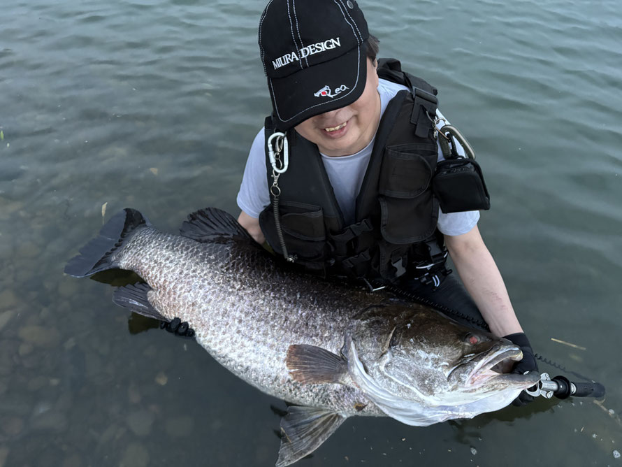 そこから始まった、合計4回に及ぶアカメ特有の死の突っ込み。 しかし、あえてソフトに設計し、バラシ対策を施したティップが、その衝撃を「いなし」続けました。ロッドは限界まで弧を描きながらも、決して主導権を渡さない。タックルと私の精神が一つになり、ついに怪物を足元まで寄せました。